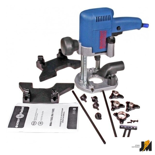 Комплектация | - Машина фрезерная МФ4-1100Э 1 шт.- Направляющая 2 шт.- Ограничитель 1 шт.- Патрубок 1 шт.- Набор копировальных втулок (4 шт.) 1 комплект- Руководство по эксплуатации 1 шт. |