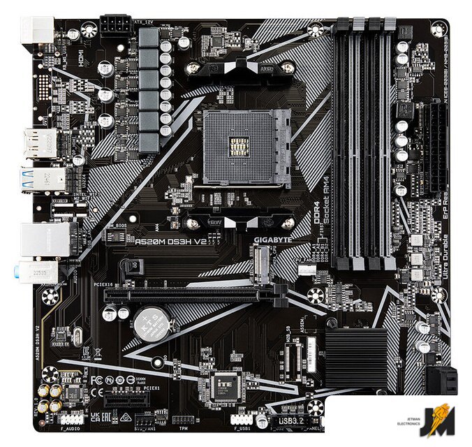 mATX, сокет AMD AM4, чипсет AMD A520, память 4xDDR4 до 4733 МГц, слоты: 1xPCIe x16, 1xPCIe x1, 1xM.2