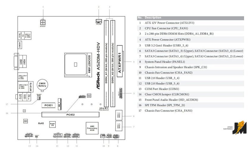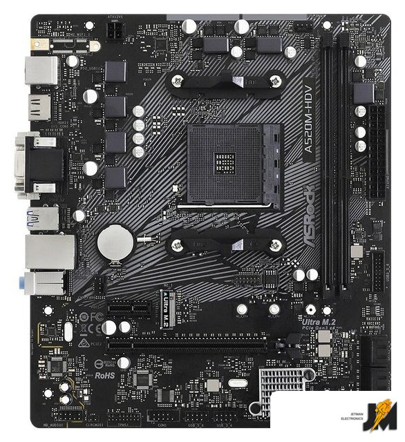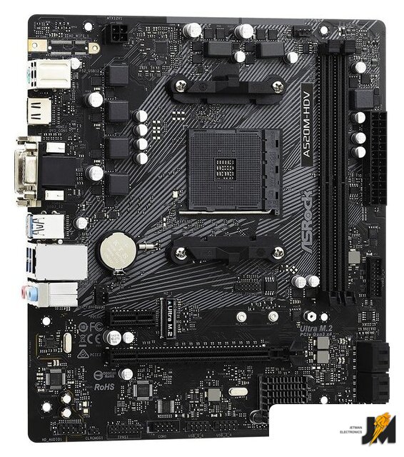 mATX, сокет AMD AM4, чипсет AMD A520, память 2xDDR4, слоты: 1xPCIe x16, 1xPCIe x1, 1xM.2