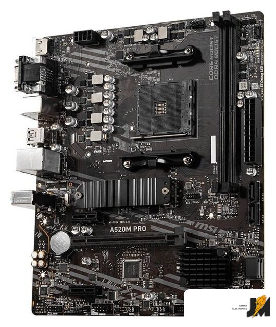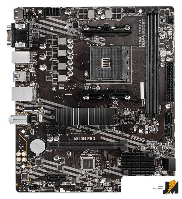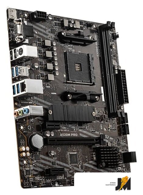 mATX, сокет AMD AM4, чипсет AMD A520, память 2xDDR4, слоты: 1xPCIe x16, 2xPCIe x1, 1xM.2