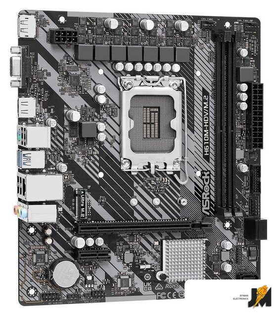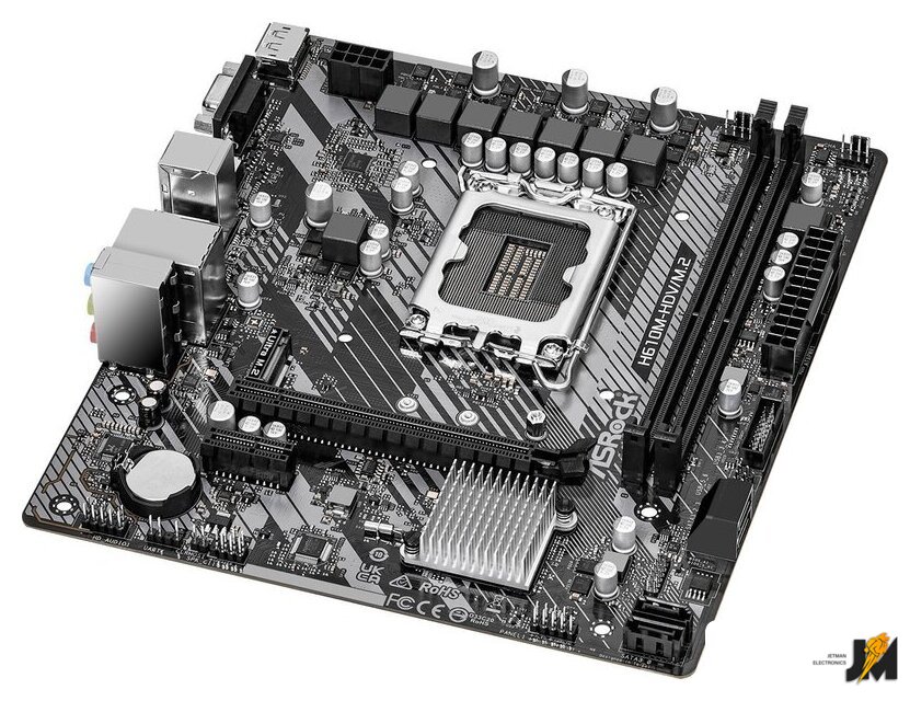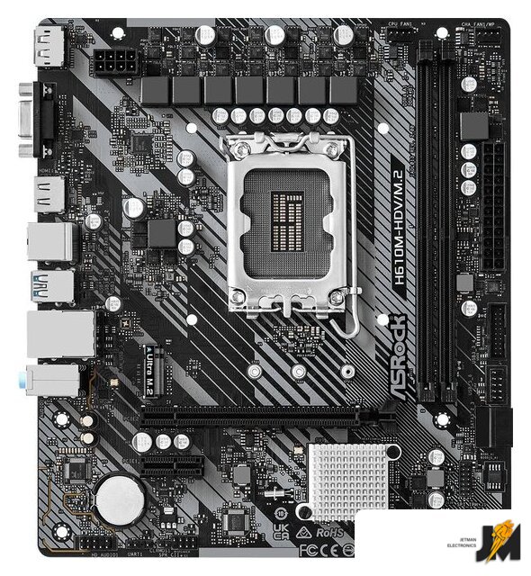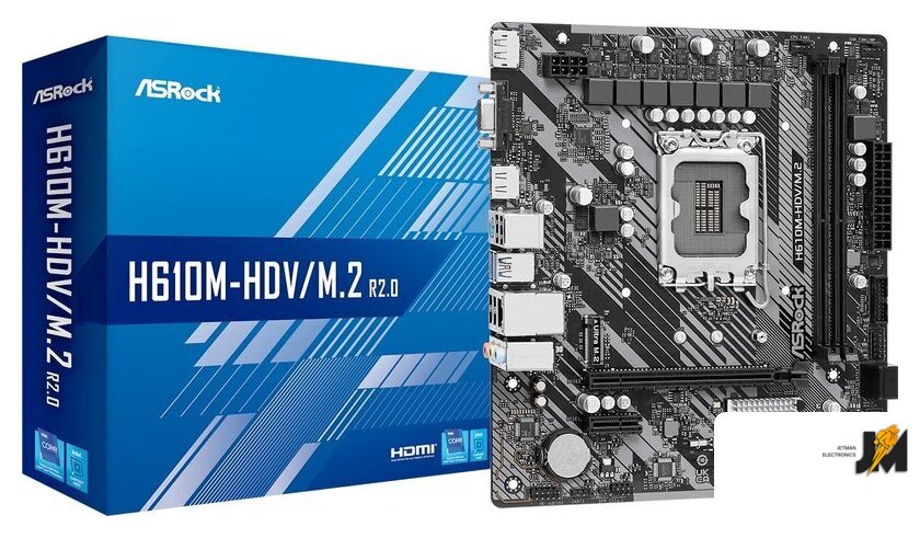 mATX, сокет Intel LGA1700, чипсет Intel H610, память 2xDDR4 до 3200 МГц, слоты: 1xPCIe x16, 1xPCIe x1, 1xM.2