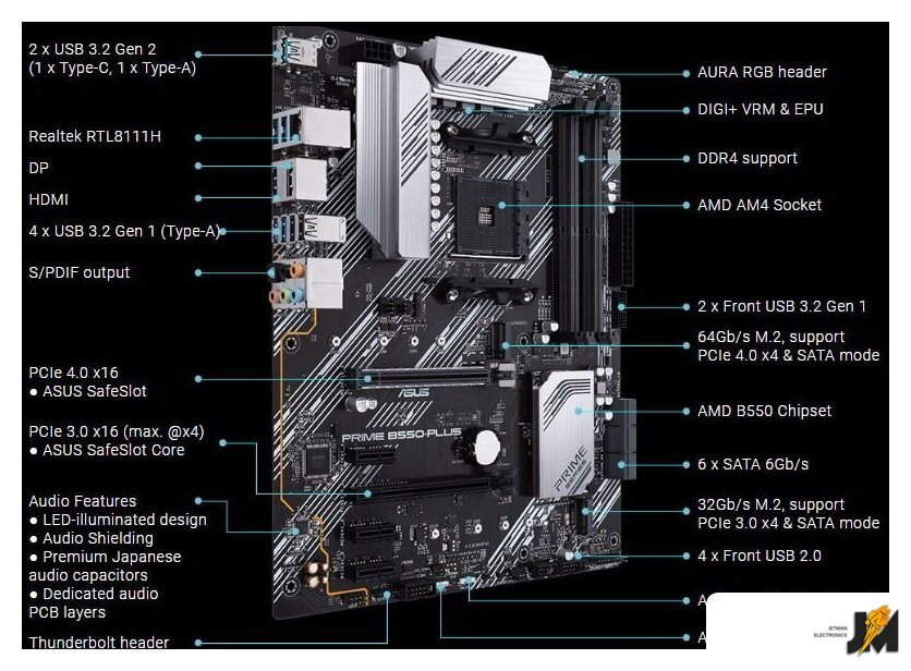 ATX, сокет AMD AM4, чипсет AMD B550, память 4xDDR4, слоты: 2xPCIe x16, 3xPCIe x1, 2xM.2