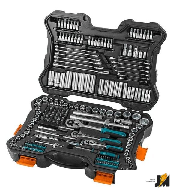 Комплектация | Рукоятка с трещеткой квадрат 1/2 (1 шт) Рукоятка с трещеткой квадрат 1/4 (1 шт) Рукоятка с трещеткой квадрат 3/8 (1 шт) Биты 6.3*25 мм (44 шт) Биты 8*30 мм (30 шт) Биты 1/2 (2 шт) Биты 1/4 (30 шт) Ключ комбинированный (12 шт) Ключ шестигранный (7 шт) Головки 1/2 (15 шт) Головки 1/4 (13 шт) Головки 3/8 (10 шт) Головки 1/2 Е-профиль (3 шт) Головки 1/4 тип Е (5 шт) Головки 3/8 тип Е (6 шт) Головка торцевая удлиненная 1/2 (5 шт) Головка торцевая удлиненная 1/4 (7 шт) Головка торцевая удлиненная 3/8 (6 шт) Головка торцевая свечная, 1/2 (2 шт) Головка торцевая свечная, 3/8 (1 шт) Кардан шарнирный 1/2 (1 шт) Кардан шарнирный 1/4 (1 шт) Кардан шарнирный 3/8 (1 шт) Удлинитель 1/2:125 мм (1 шт) Удлинитель 1/2:250 мм (1 шт) Удлинитель 1/4:50 мм (1 шт) Удлинитель 1/4:100 мм (1 шт) Удлинитель 3/8 150 мм (1 шт) Вороток Т-образный 1/4 (1 шт) Рукоятка для бит (1 шт) Рукоятка для головок (1 шт) Адаптер для бит (3 шт) |