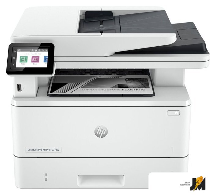 Комплектация | МФУ HP LaserJet Pro 4103fdw; предустановленный оригинальный лазерный картридж для HP LaserJet, черный (3050 страниц); руководство по началу работы; листовка с информацией о поддержке; руководство по гарантии; листовка с нормативными требованиями; кабель питания; кабель USB |